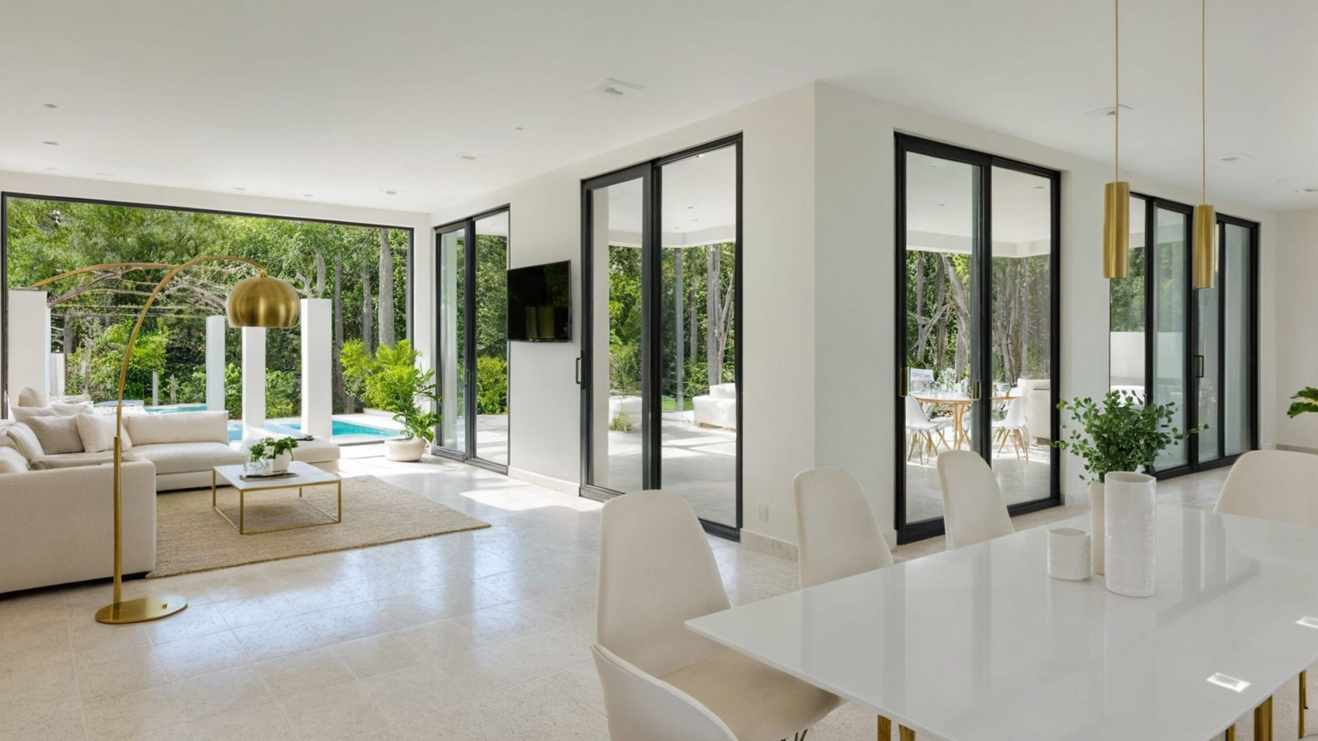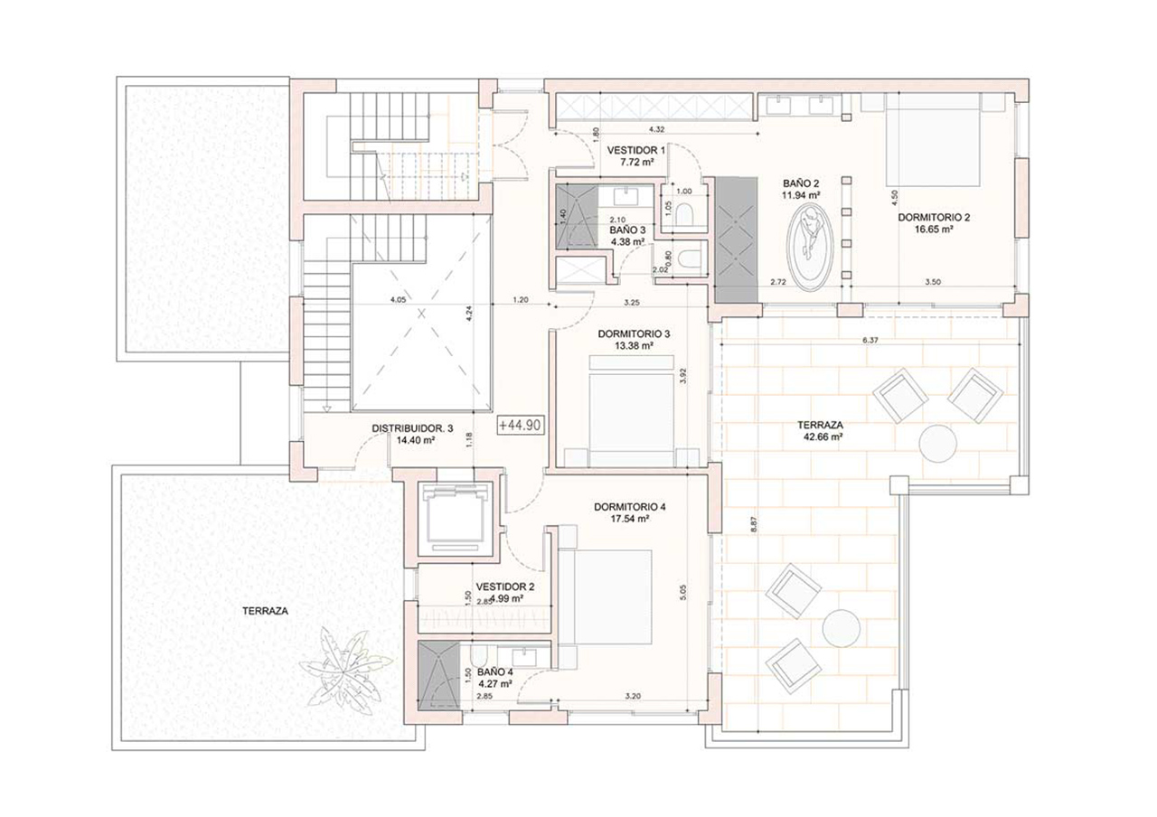 The layout of the villa has been designed to combine functionality, spaciousness and elegance in every corner. The ground floor houses the living area, consisting of a spacious living-dining room with an open-plan designer kitchen, which flows seamlessly onto the outdoor terraces and swimming pool. This level also includes auxiliary rooms and spaces designed for maximum comfort, such as an en-suite guest bedroom and a garage with direct access to the house. On the first floor there are 3 bedrooms, each with its own en-suite bathroom. The basement of the house also offers a laundry room and a multi-purpose room, where you could install a gym, for example.