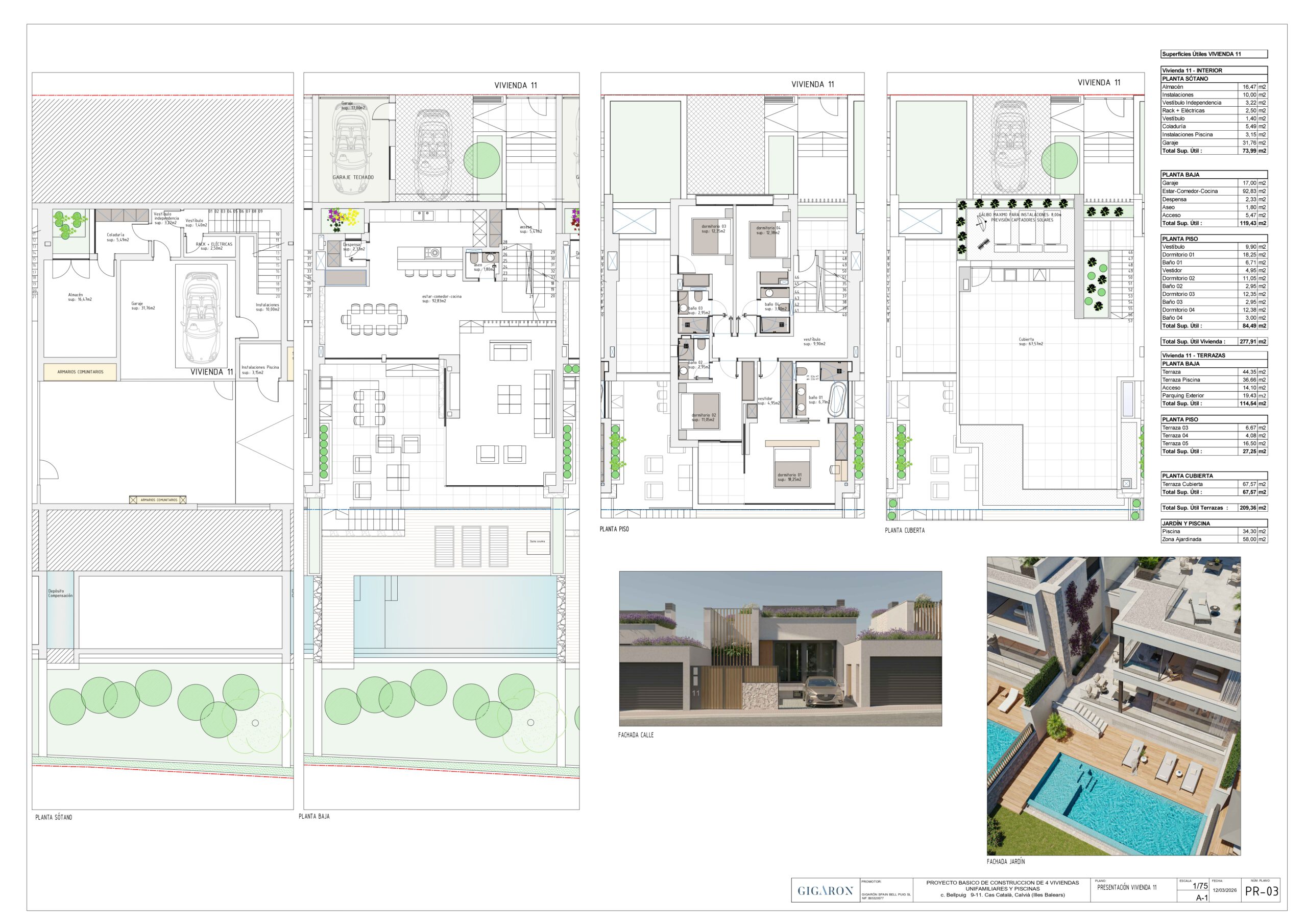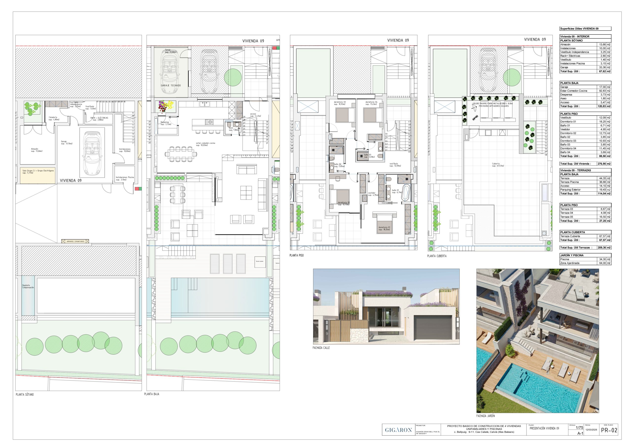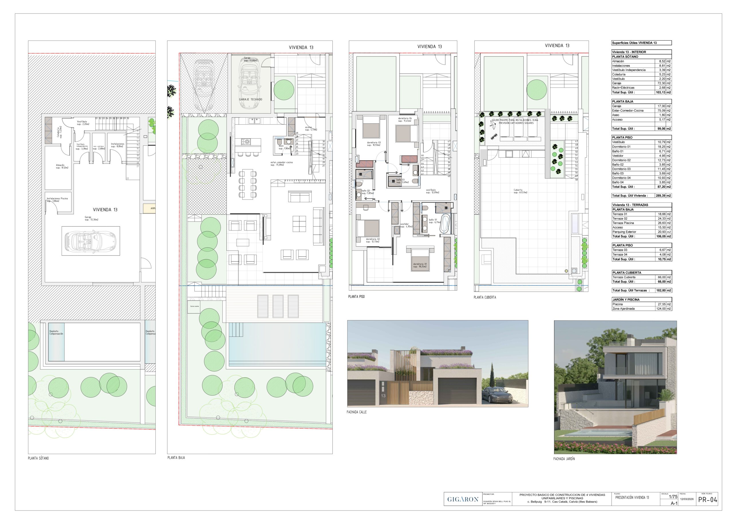 Discover the layout and exclusive design of Bell Puig Villas through our detailed floor plans! Each 300 m² villa is carefully designed to offer spacious and functional spaces, with four bedrooms, open-plan areas and terraces that connect with the Mediterranean surroundings.